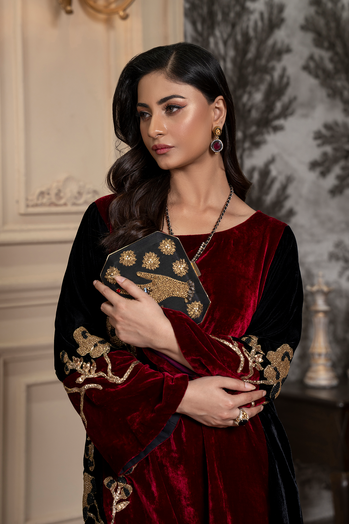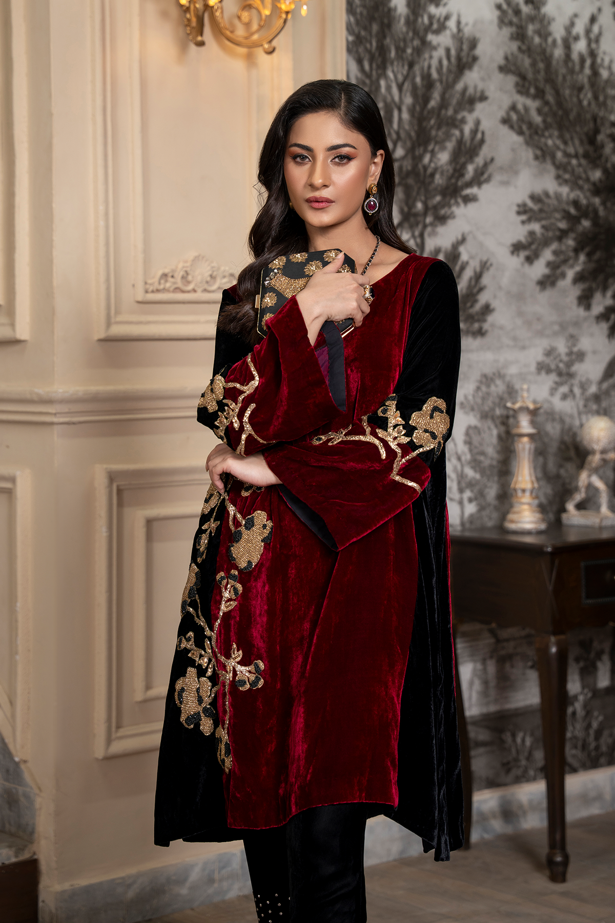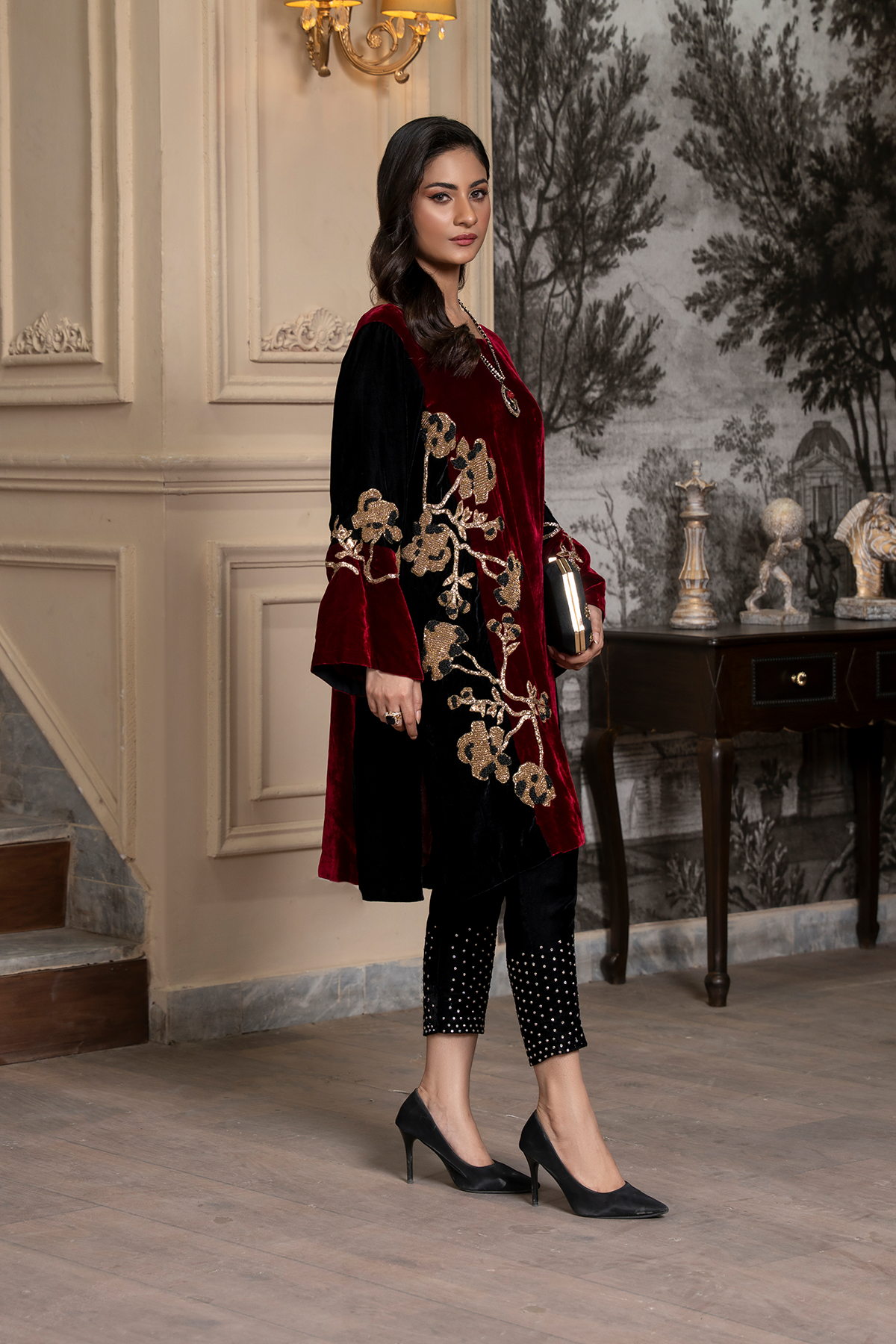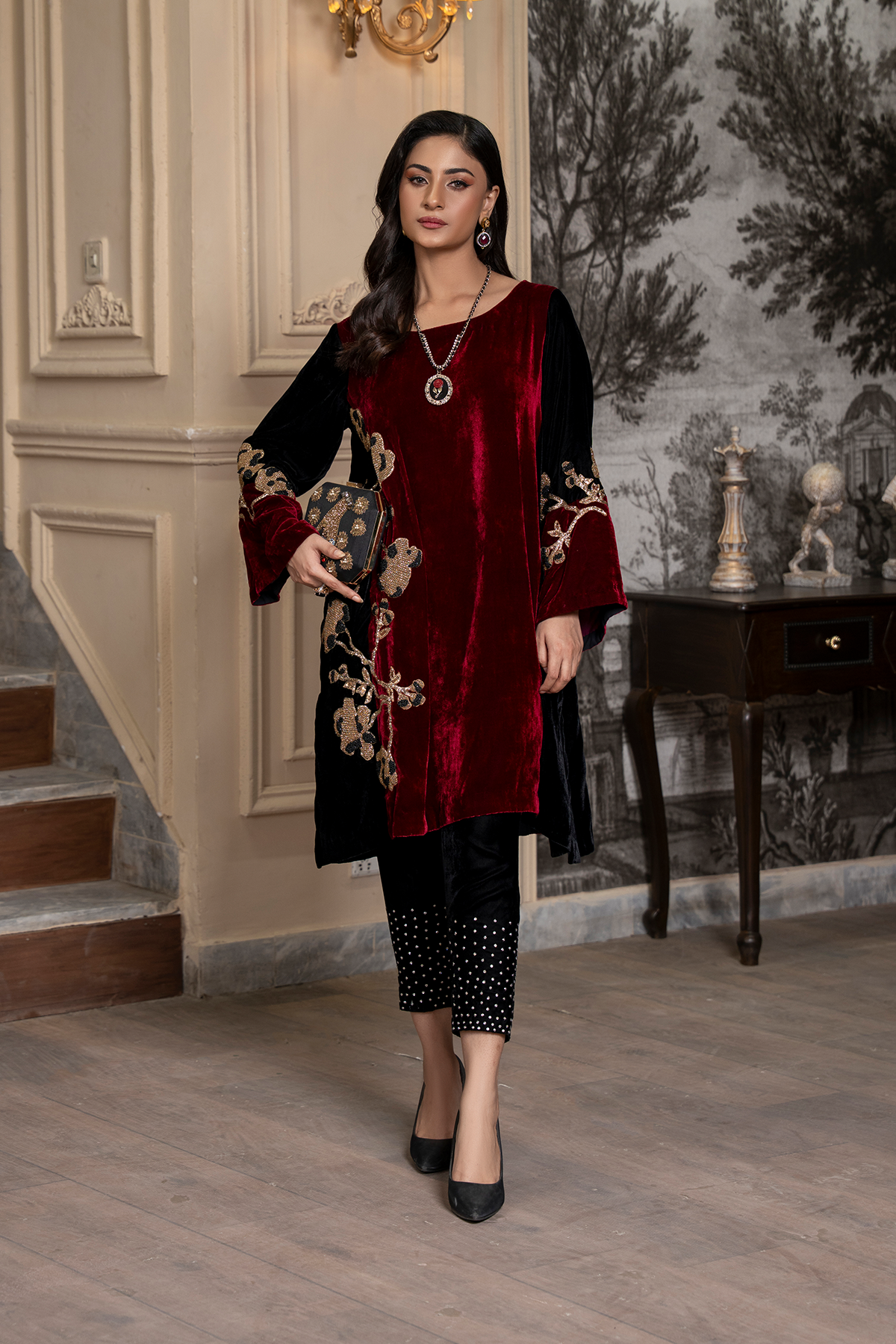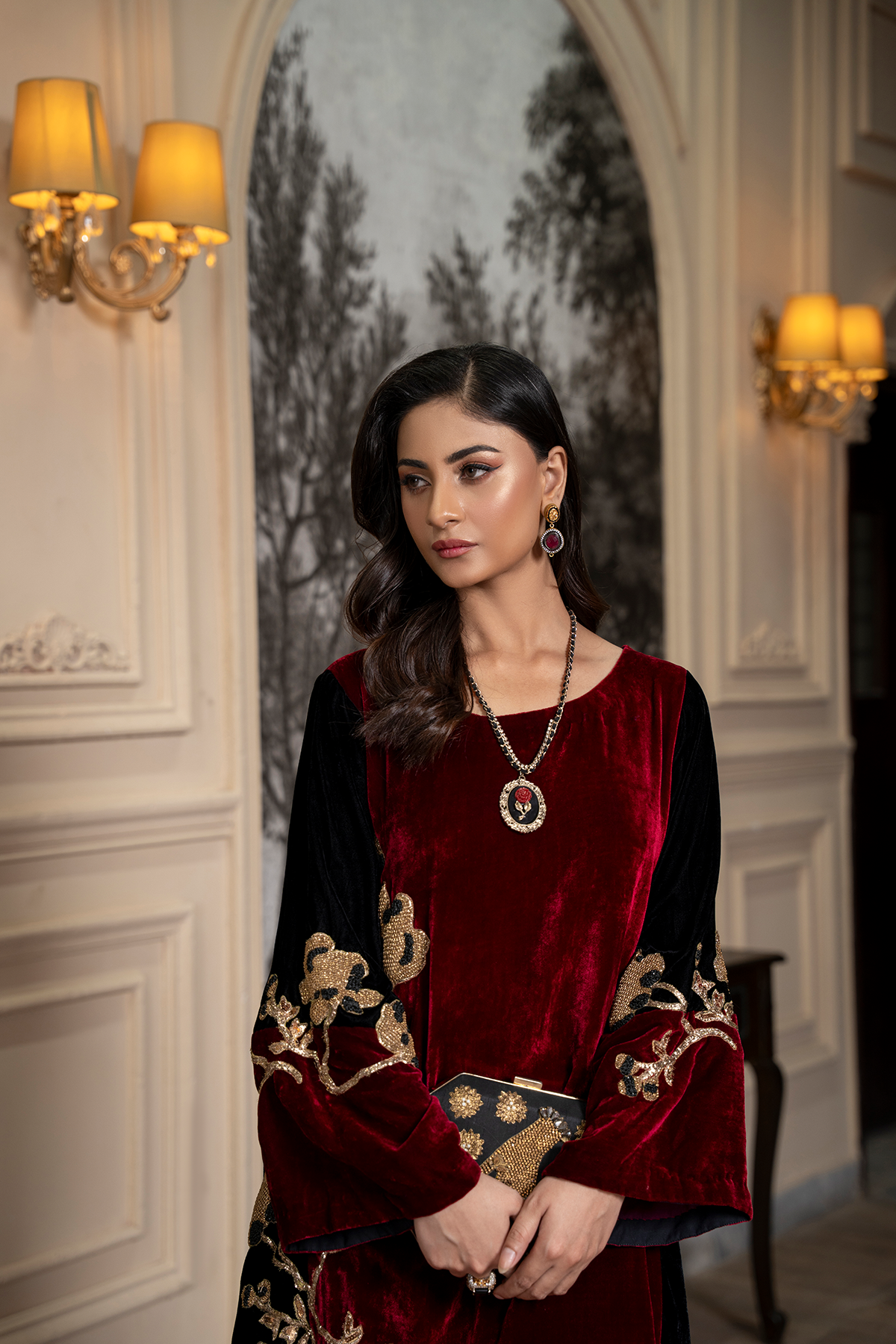 Shirt: Premium Maroon Velvet with Gold Embroidery