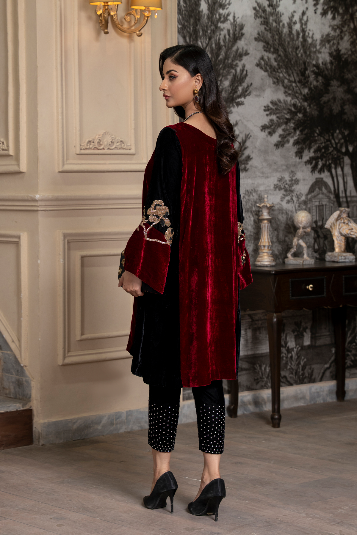 Paired with sleek black trousers adorned with delicate silver dots detailing at the hem, this ensemble beautifully blends deep tones with subtle shimmer — perfect for evening gatherings, winter festivities, or formal celebrations.