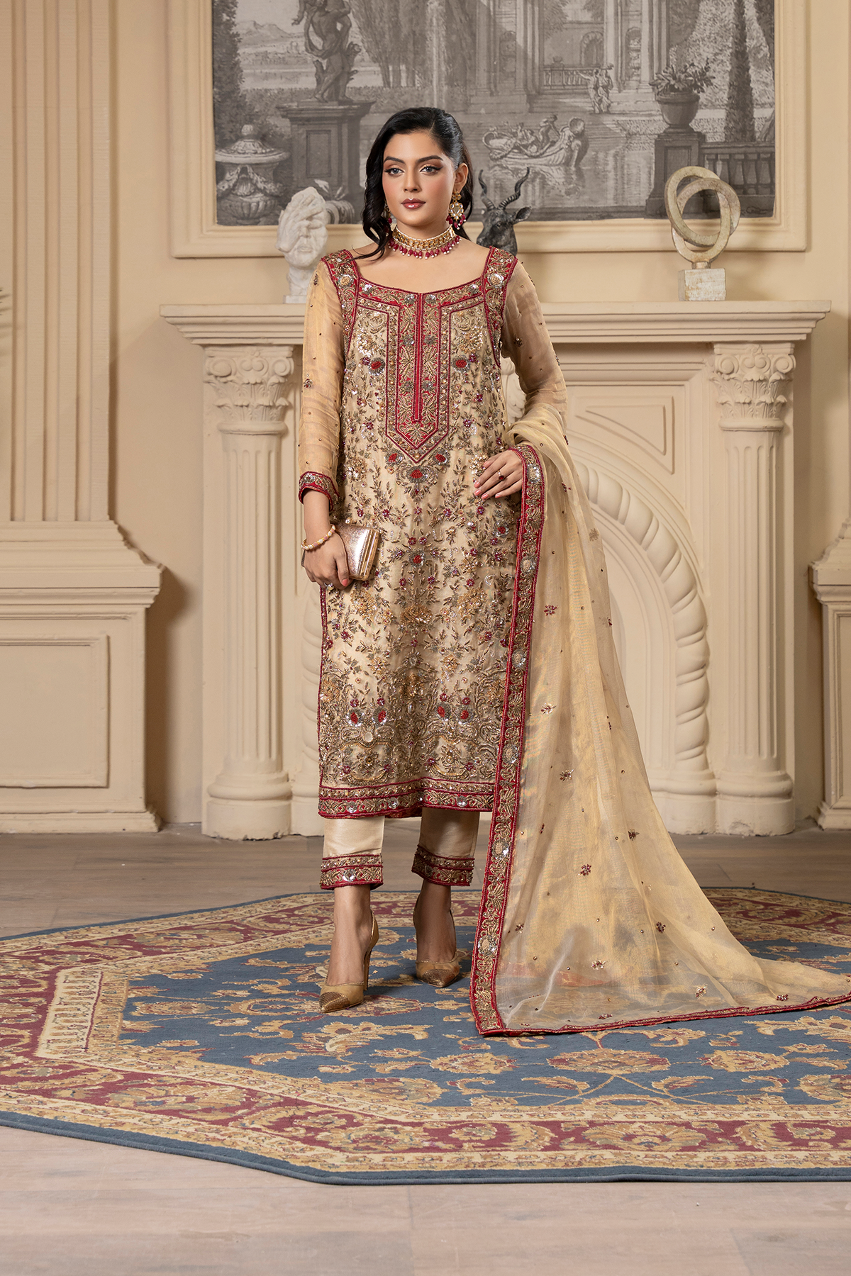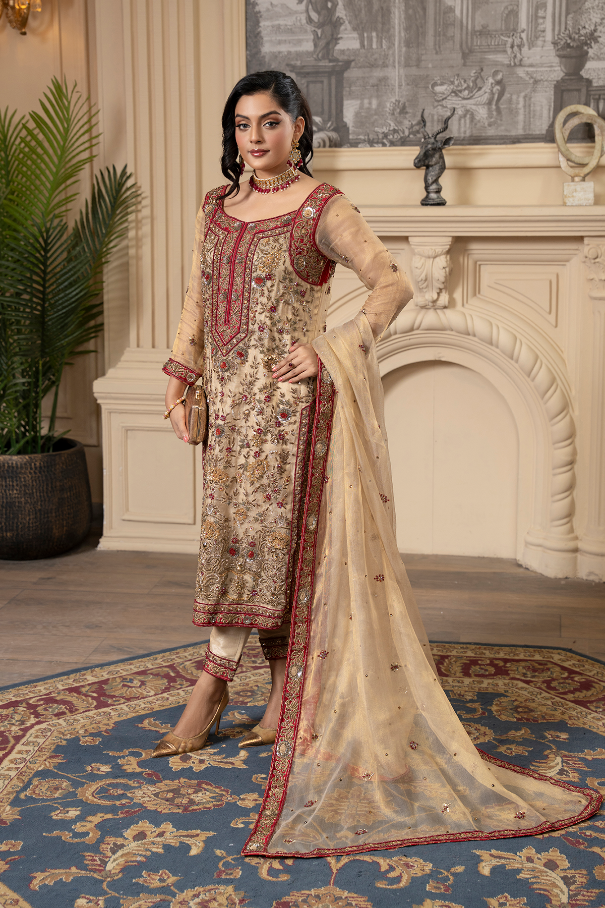 Elevate your wardrobe with Opaline Whisper, a modern classic from Vogue Luxe’s Silk & Velvet Bloom collection. This beige silk ensemble exudes refined sophistication, adorned with champagne and maroon floral embroidery that captures timeless femininity with a contemporary twist.