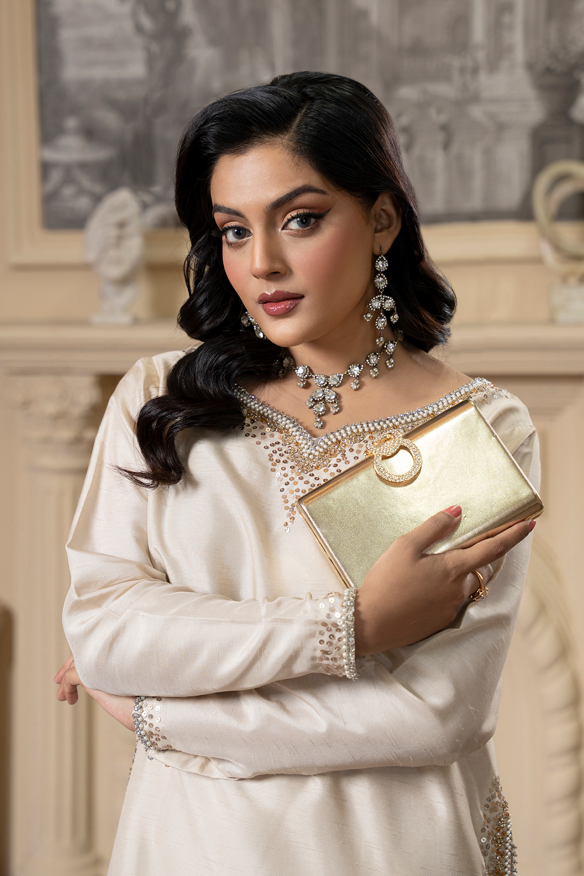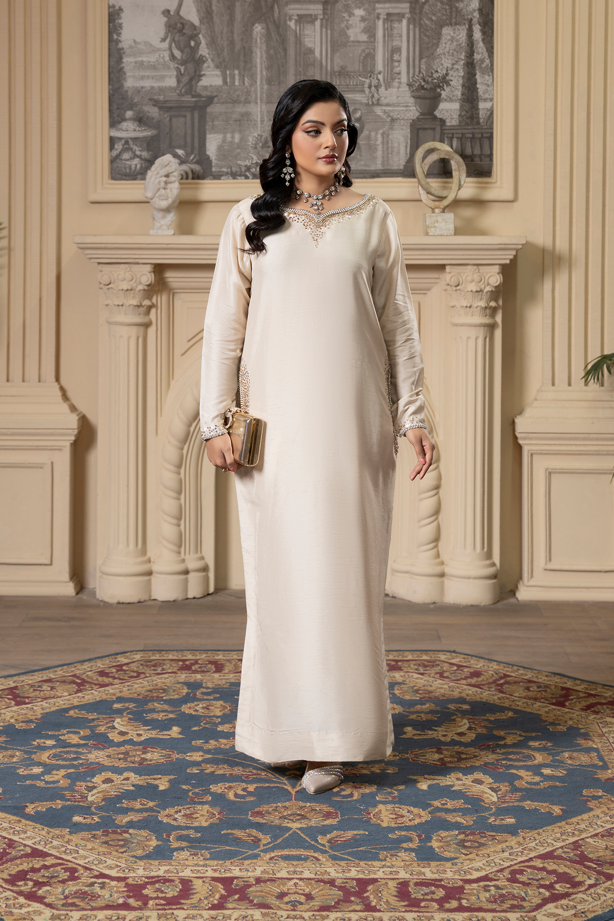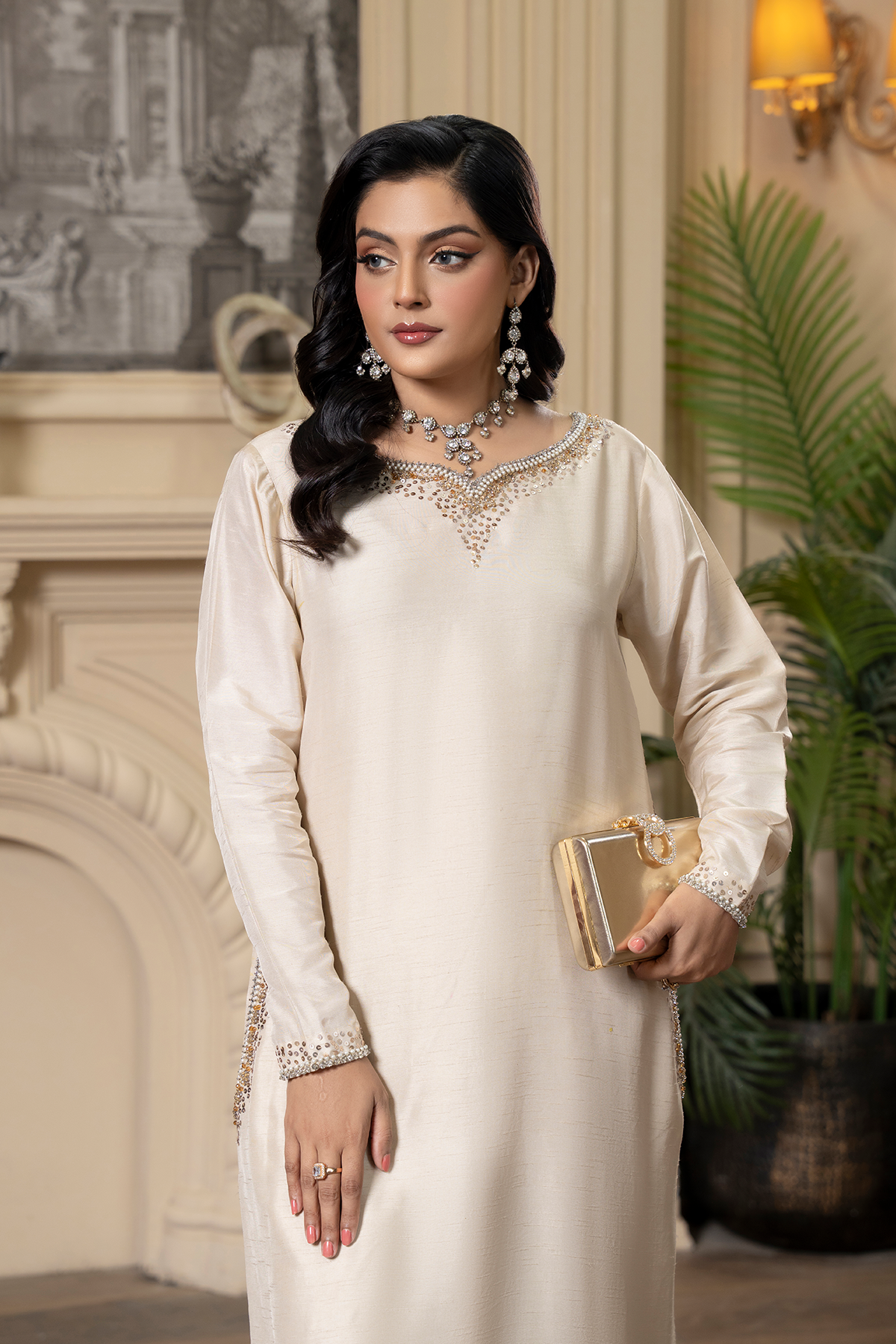 Pair with statement earrings and nude heels for a polished, graceful look that’s perfect for festive or formal occasions.